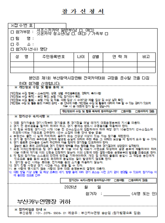 '부산카누연맹'으로 접수 ① 신청서 작성 → ② 메일 제출 (74canoe@hanmail.net) → ③ 확인전화 (051-941-1556) |
